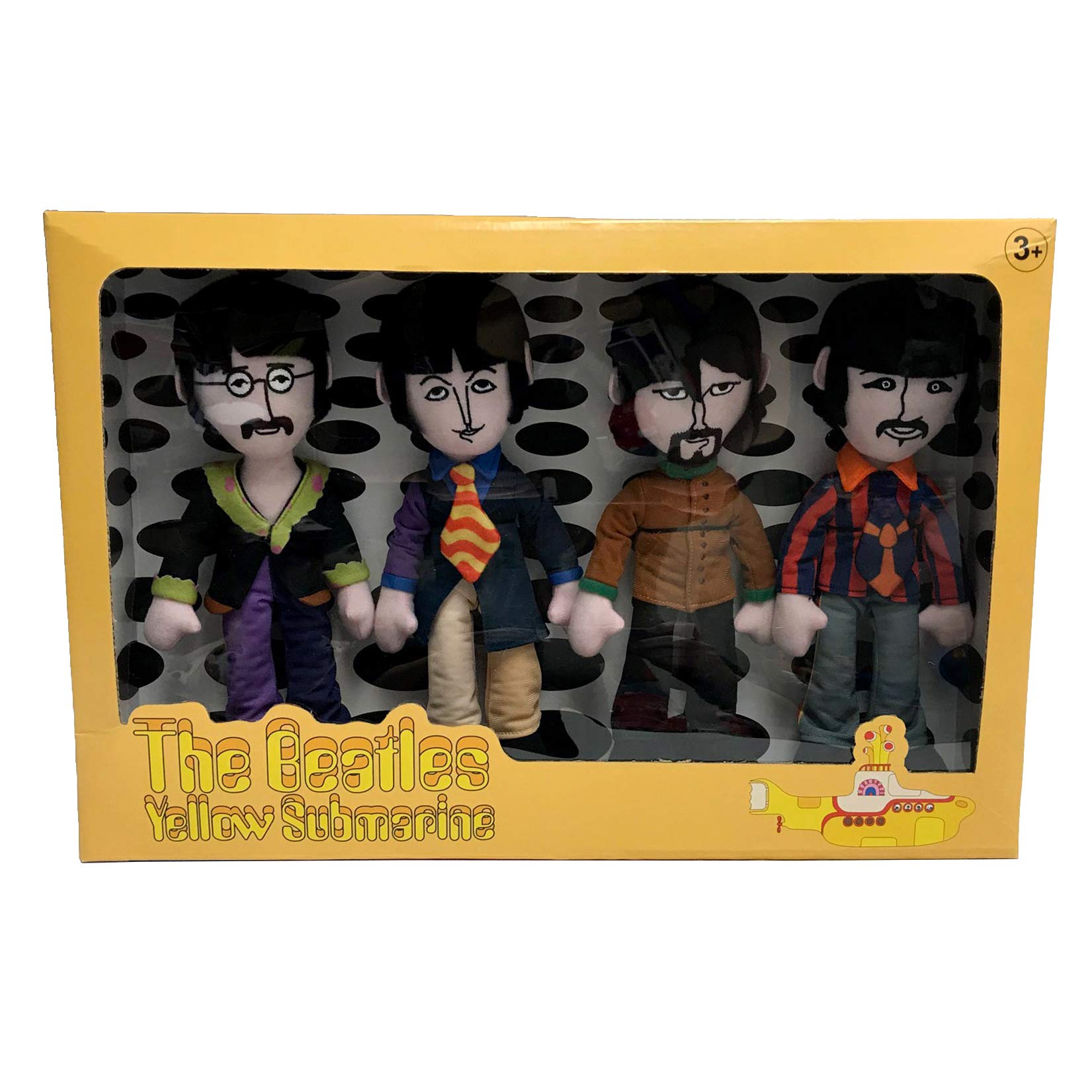 • A quartet of plush band members—John, Paul, George, and Ringo—each crafted with distinctive styling and colors inspired by the Yellow Submarine era.
